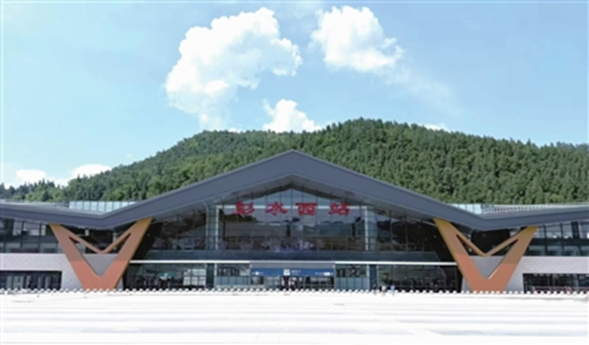 彭水西站站房建筑面积约1.2万平方米,采用“线侧下式”布局,规模为2台4线,最高可容纳1200名旅客,可实现旅客到站后3分钟快速换乘、10分钟抵达城区。车站设计深度融合苗乡文化,以蚩尤九黎城的建筑风格为灵感,打造“站、场、景”一体化特色,成为展示彭水民族风情的新窗口。